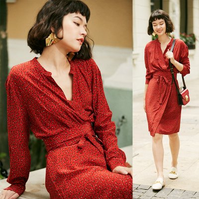 当前位置:首页-女装-惊艳!法式复古印花16姆米真丝连衣裙小碎花收腰气质桑蚕丝裙子