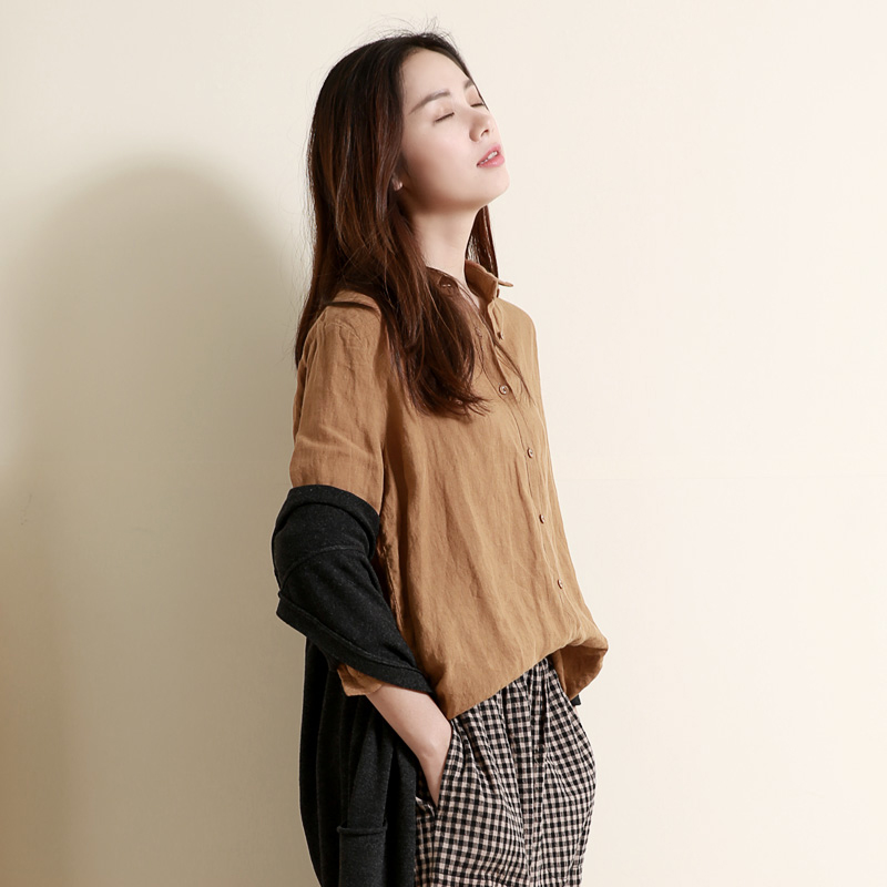谷家出品 文艺棉麻衬衣女装新款上衣 设计感小众宽松长袖亚麻衬衫