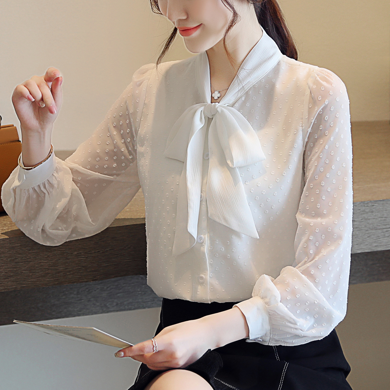 2021春秋新款韩版修身气质波点雪纺衬衫女蝴蝶结白色打底长袖小衫