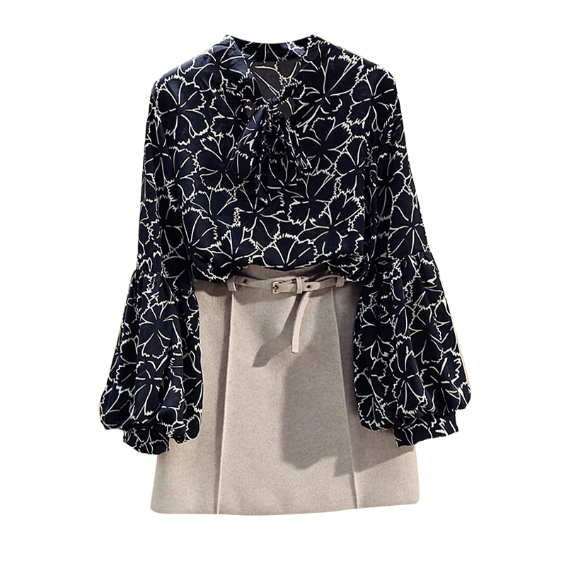 2021秋季新款小立领蝴蝶结碎花长袖女衬衫蝴蝶结灯笼袖雪纺衫上衣