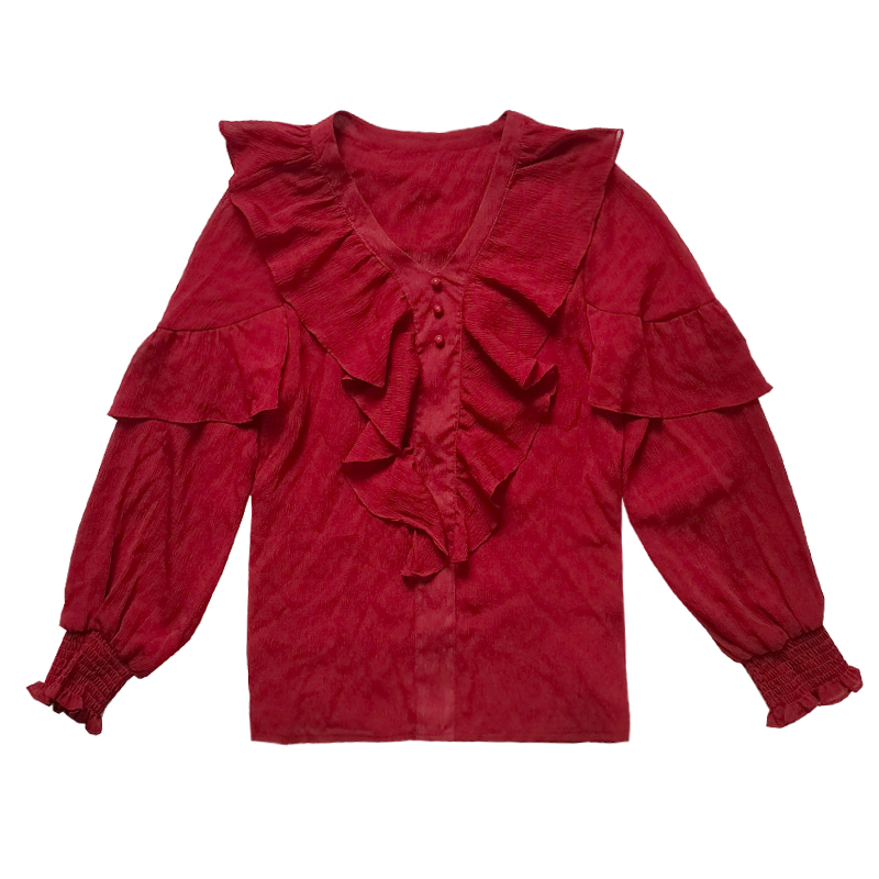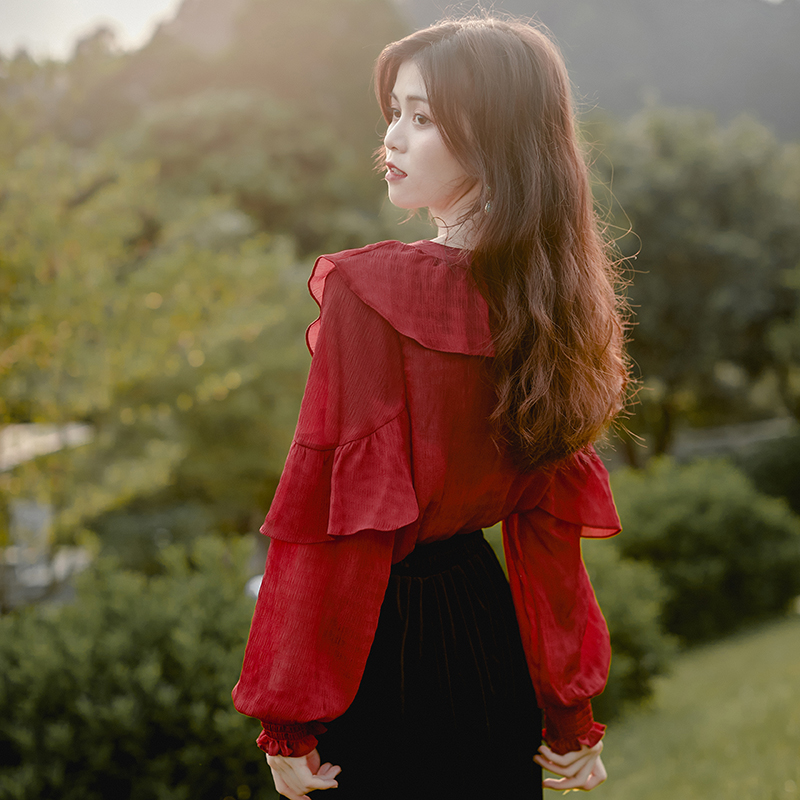 蜜搭 复古法式长袖衬衣荷叶V领气质红色设计感小众雪纺衬衫女春装