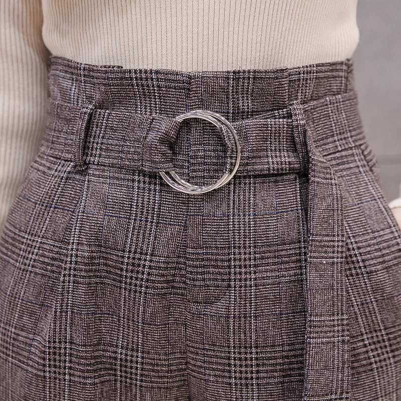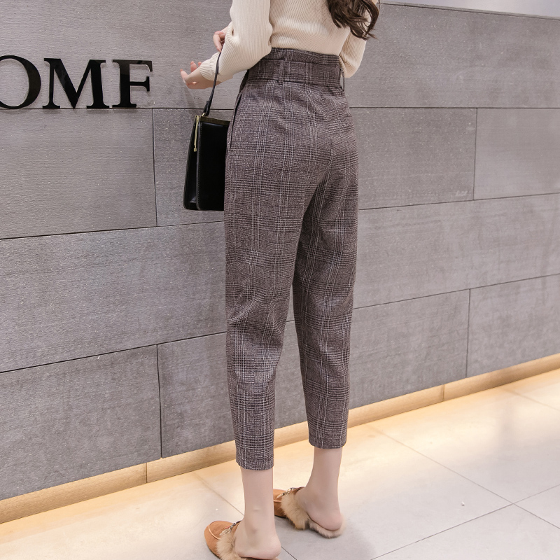 2021春秋新款格子哈伦裤女花苞腰萝卜裤高腰显瘦毛呢九分小脚裤子