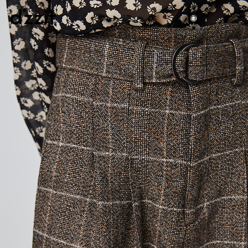 dzzit地素 秋冬新款新款卡其羊毛薄呢格纹高腰裤女3G4Q4143N