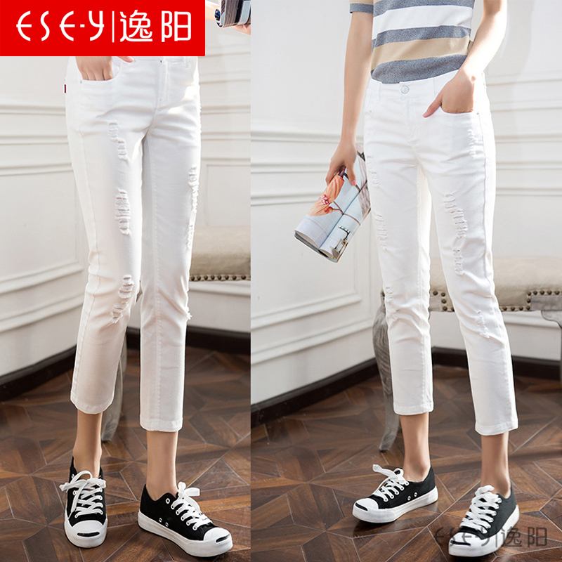 逸阳女裤2021夏季新款白色破洞牛仔裤女薄款八分修身高腰直筒0372