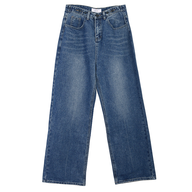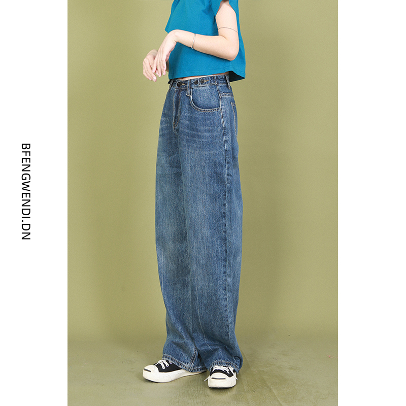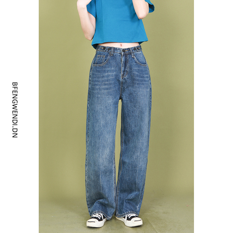 丹尼家2021秋装直筒可调节高腰宽松阔腿阔脚拖地老爹牛仔长裤 女