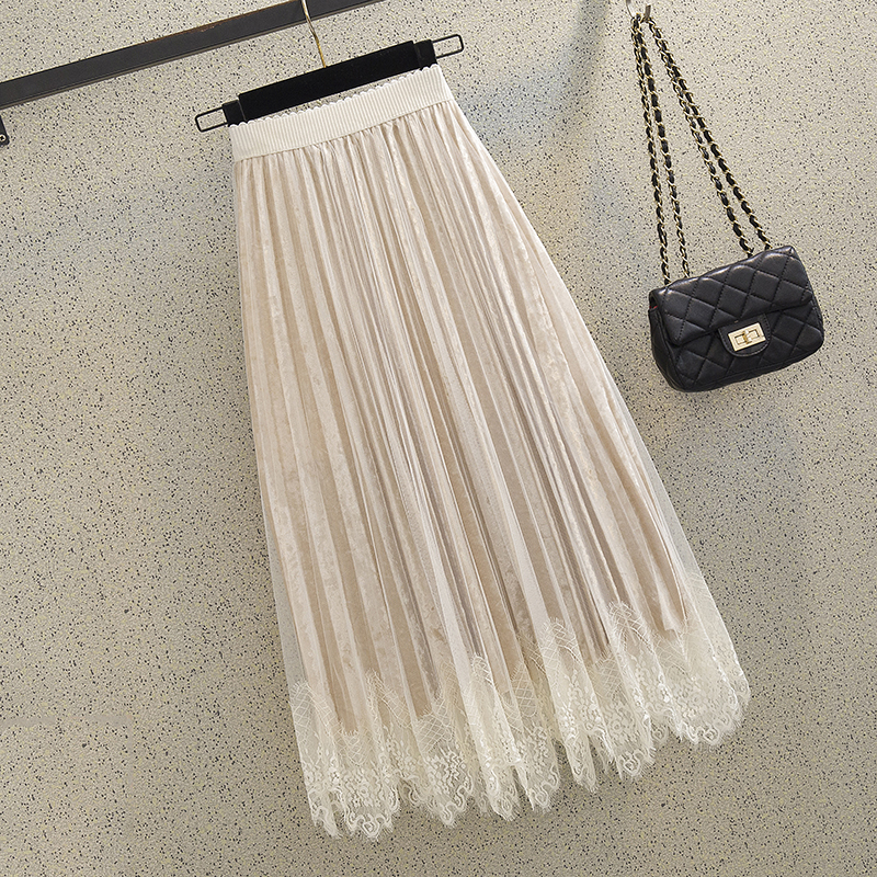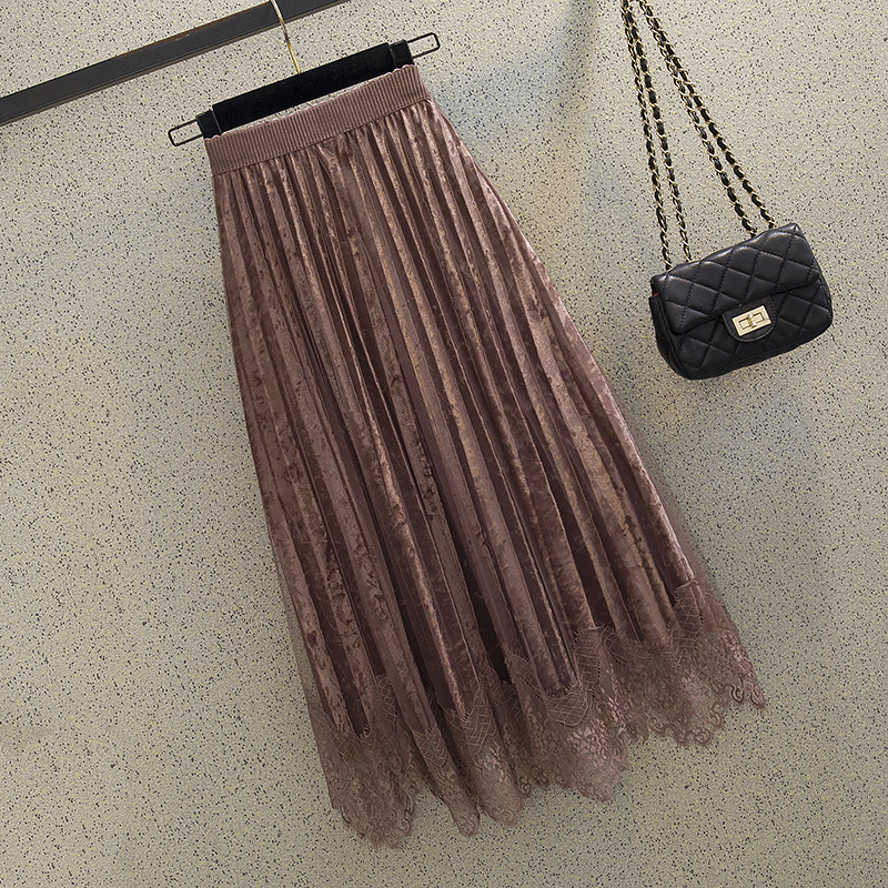 金丝绒半身裙女2021秋冬a字网纱拼接蕾丝中长款百褶裙女高腰裙子