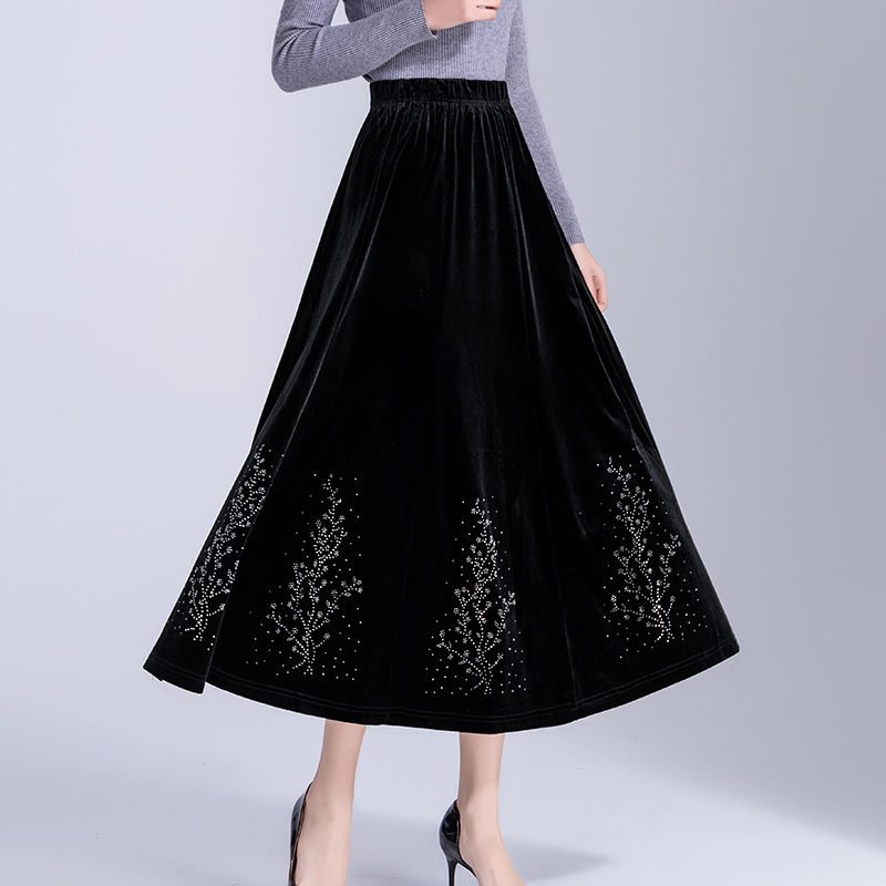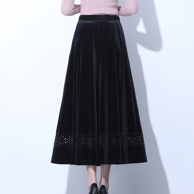 半身裙秋冬女高腰跳舞裙大摆a字中长款妈妈百褶裙子金丝绒半身裙