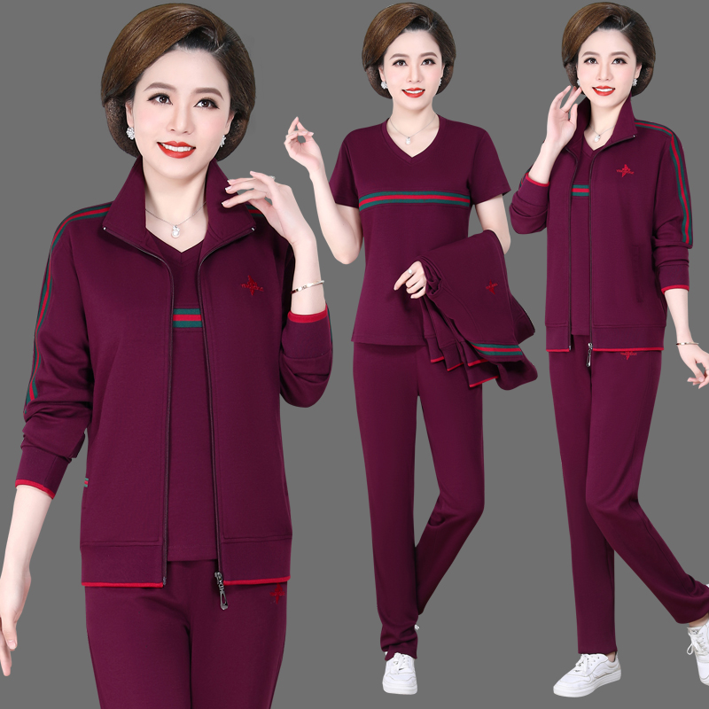 妈妈休闲运动套装2021新款三件套中老年女装上衣中年大码春秋外套
