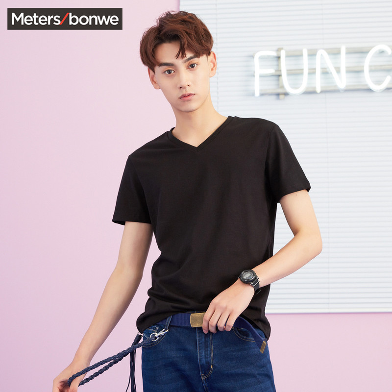 美特斯邦威短袖t恤男装夏季纯棉纯色v领修身韩版潮流半袖打底衫