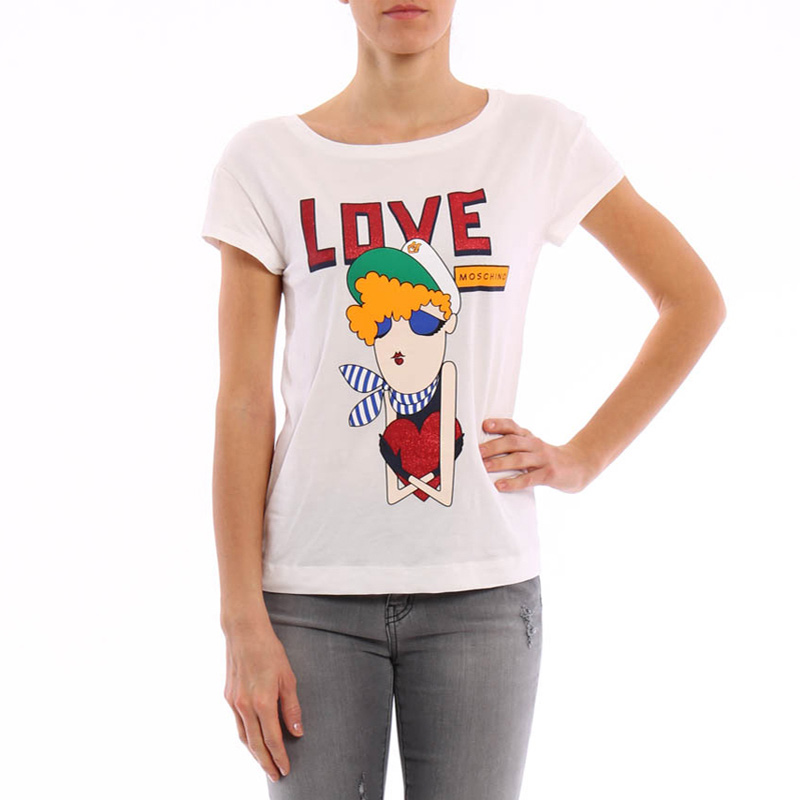 Love Moschino 爱莫斯奇诺 女装白色棉质图案印花圆领短袖T恤