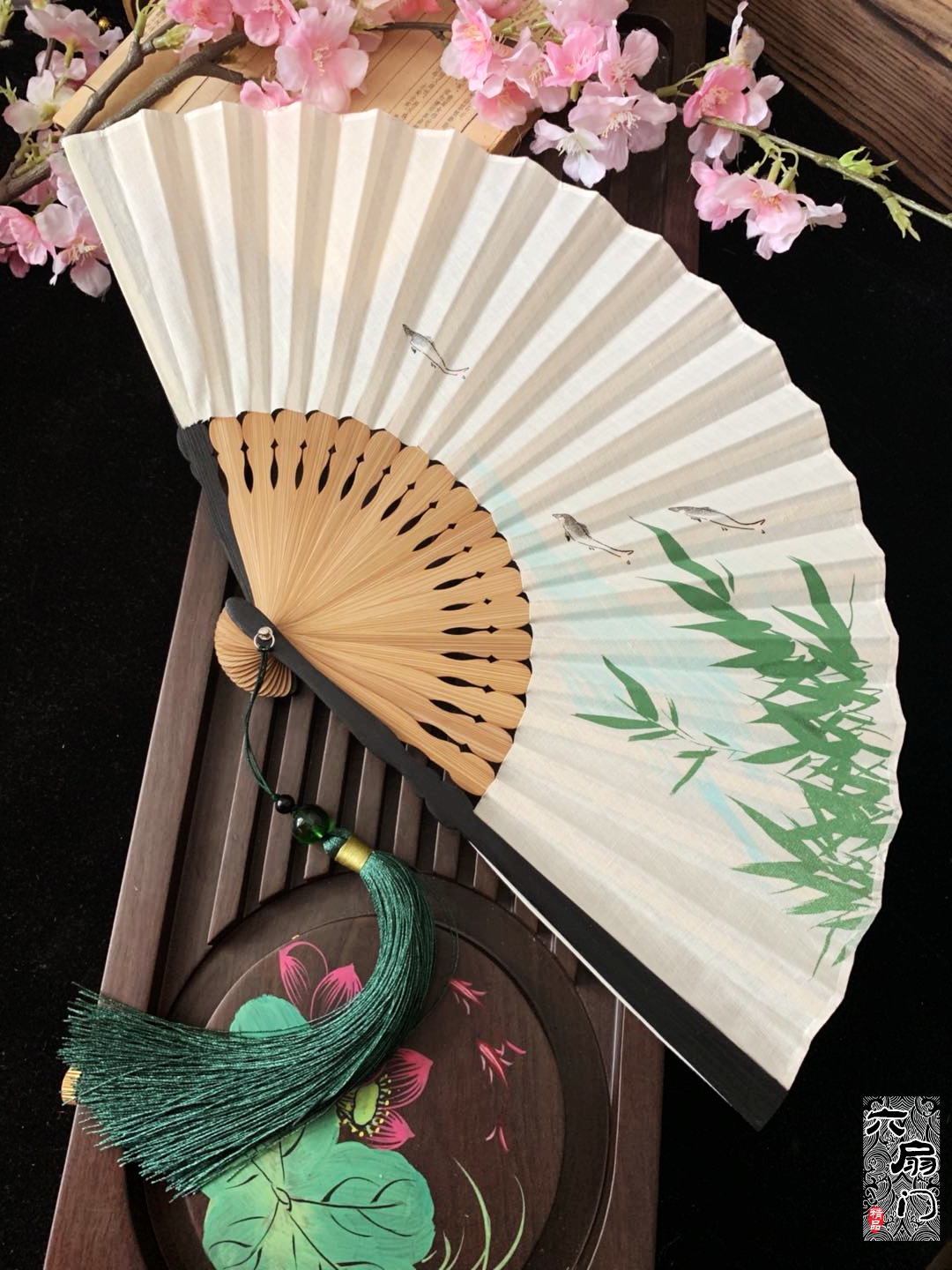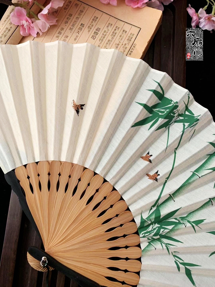 中国风7寸折扇子复古风棉麻竹林扇男女汉服夏季随身折叠绿色日用