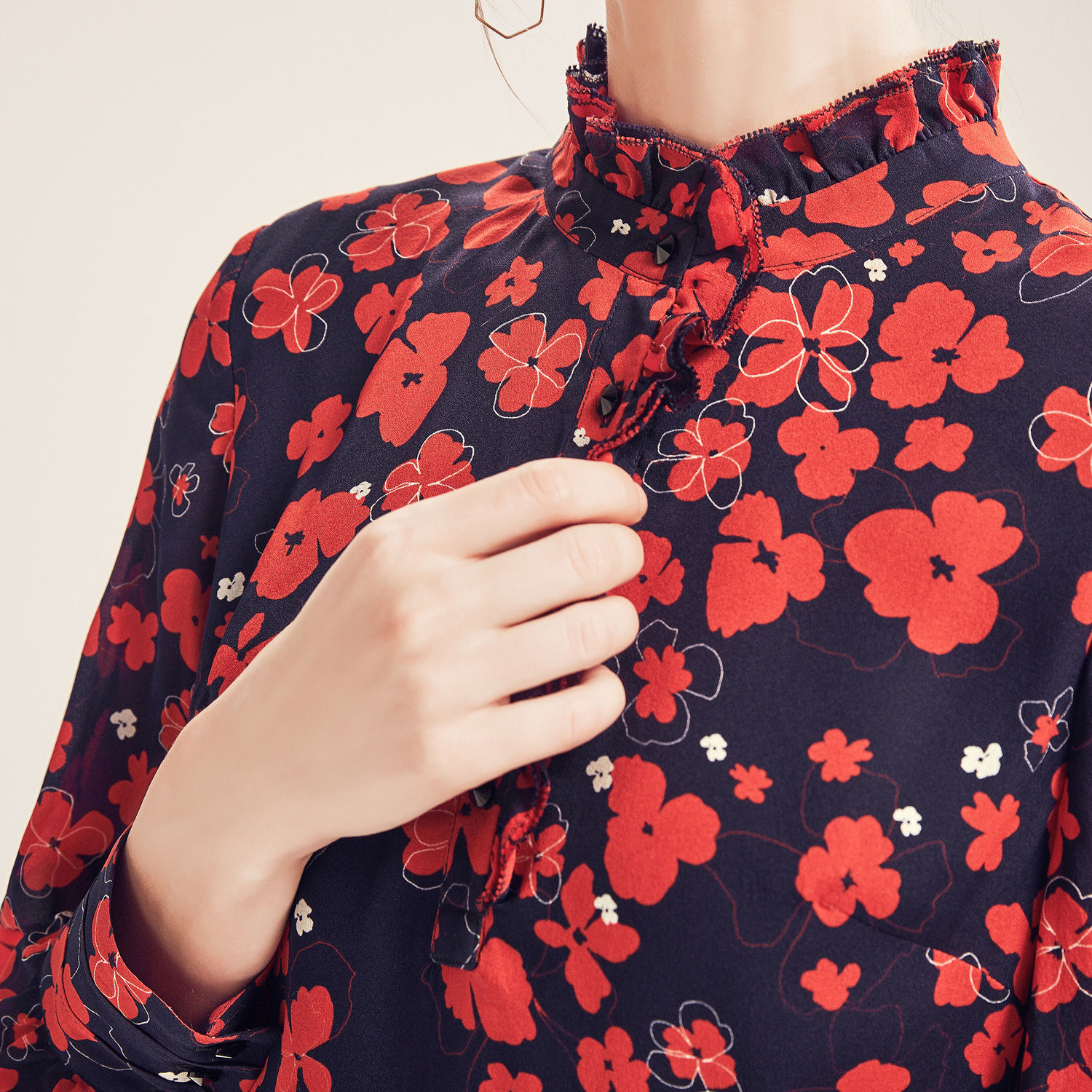 JUZUI/玖姿春季碎花印花立领桑蚕丝真丝领雪纺连衣裙女