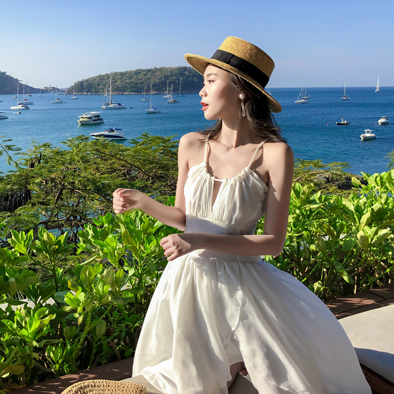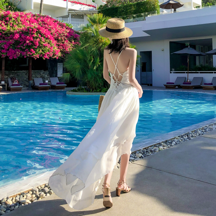 很仙的沙滩裙白色法国小众吊带漏背挂脖连衣裙夏海边度假沙滩裙仙