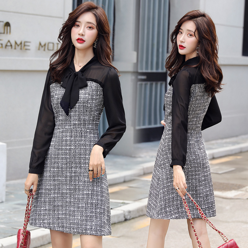 小香风格子连衣裙女雪纺长袖秋装2021新款气质显瘦中长款打底裙子