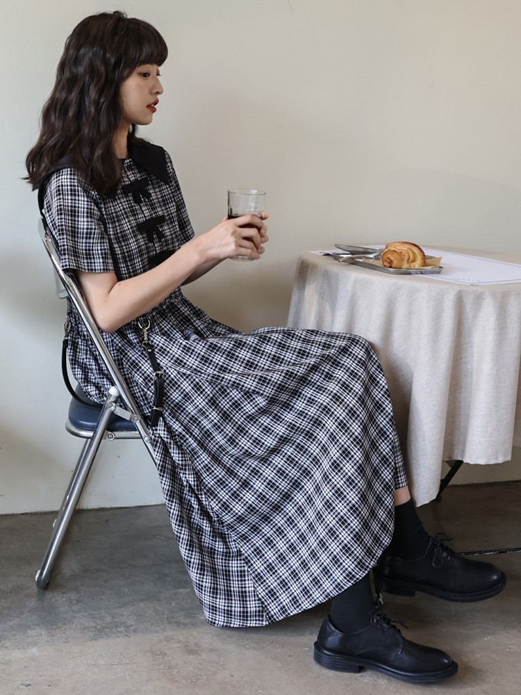 尔给新款初恋少女法式复古格子连衣裙海军领艺术感气质小裙子学生