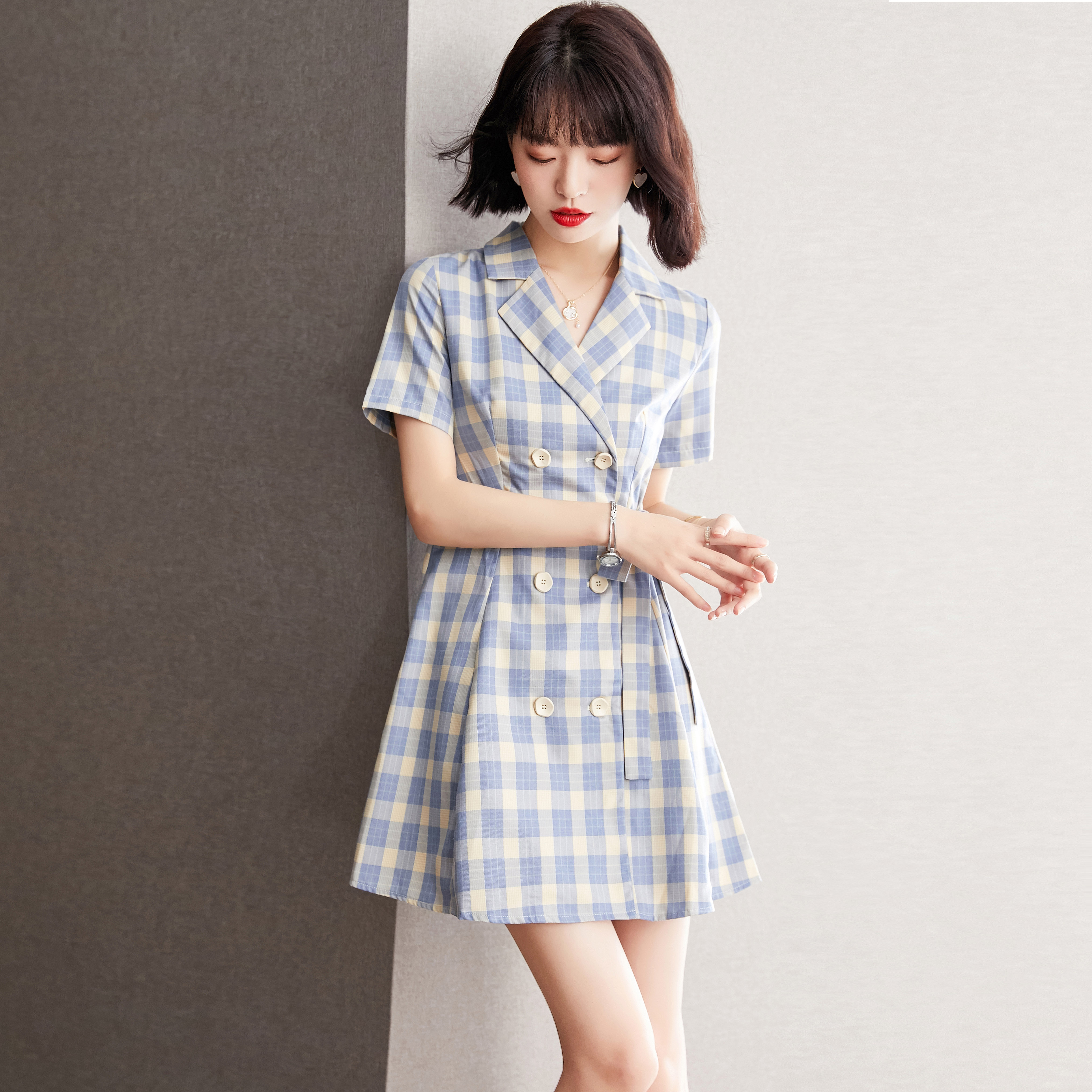 2021夏季新款阔色小紫薯西装领连衣裙短女收腰格子裙子