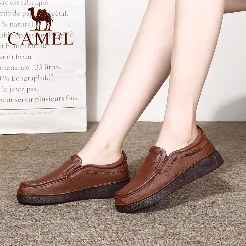 Camel/骆驼休闲鞋秋季新款真皮妈妈鞋深口单鞋牛筋底皮鞋坡跟女鞋