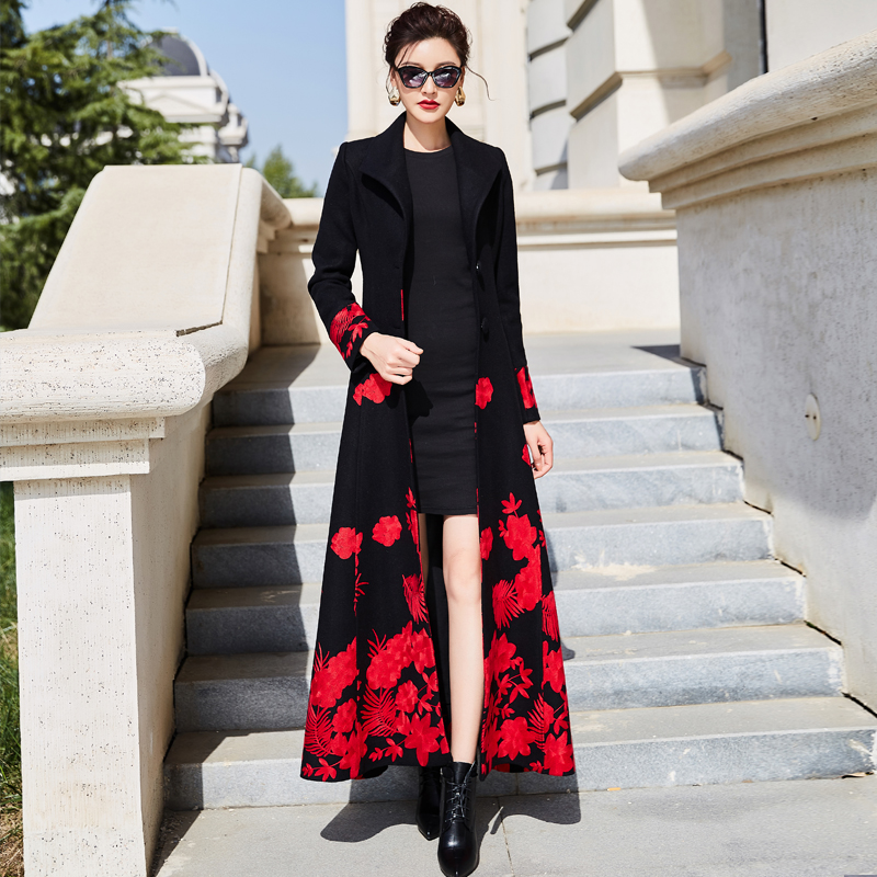 2021春新款高档刺绣民族风气质修身超长款毛呢外套女羊绒大衣过膝