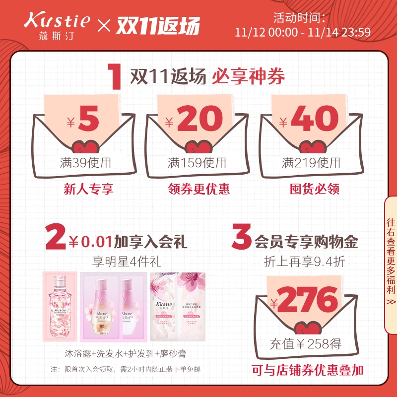 淘宝kustie蔻斯汀旗舰店优惠券,蔻斯汀改善毛躁优惠券,蔻斯汀樱花花瓣洗发水露控油蓬松护发素套装香味持久留香改善毛躁优惠券