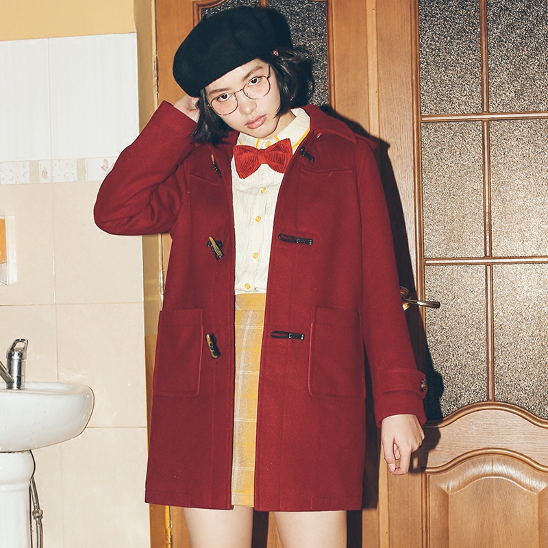 omont蛋挞家 复古学院风连帽中长款牛角扣毛呢子大衣女外套秋冬季
